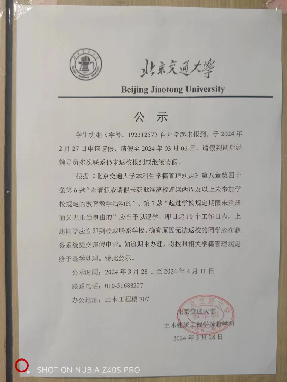 关于沈继(学号19231257)未返校报到或继续请假情况公示